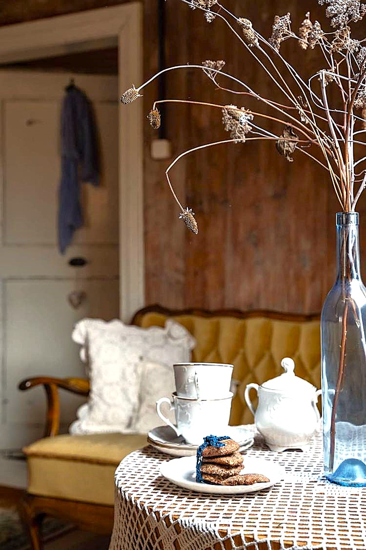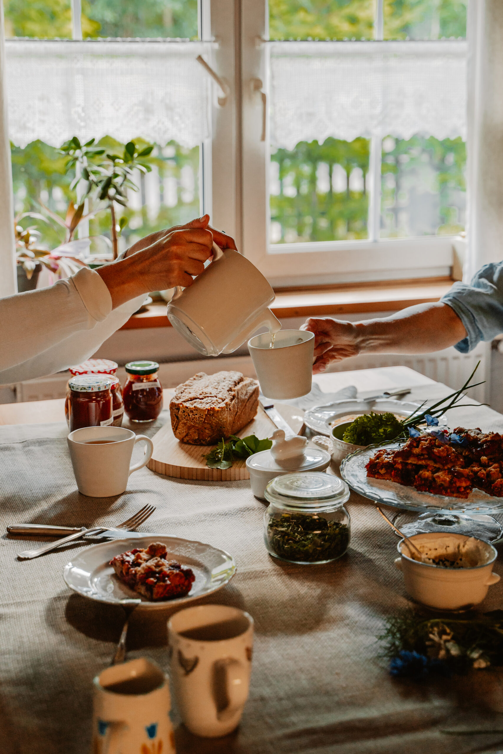 Rano serwujemy niespieszne, śniadania z produktów od lokalnych rolników, własnego wypieku z wykorzystaniem warzyw i jadalnych kwiatów z naszego ogródka. Takie, przy wspólnym stole gdzie czasem rozmowy mocno się przeciągają.