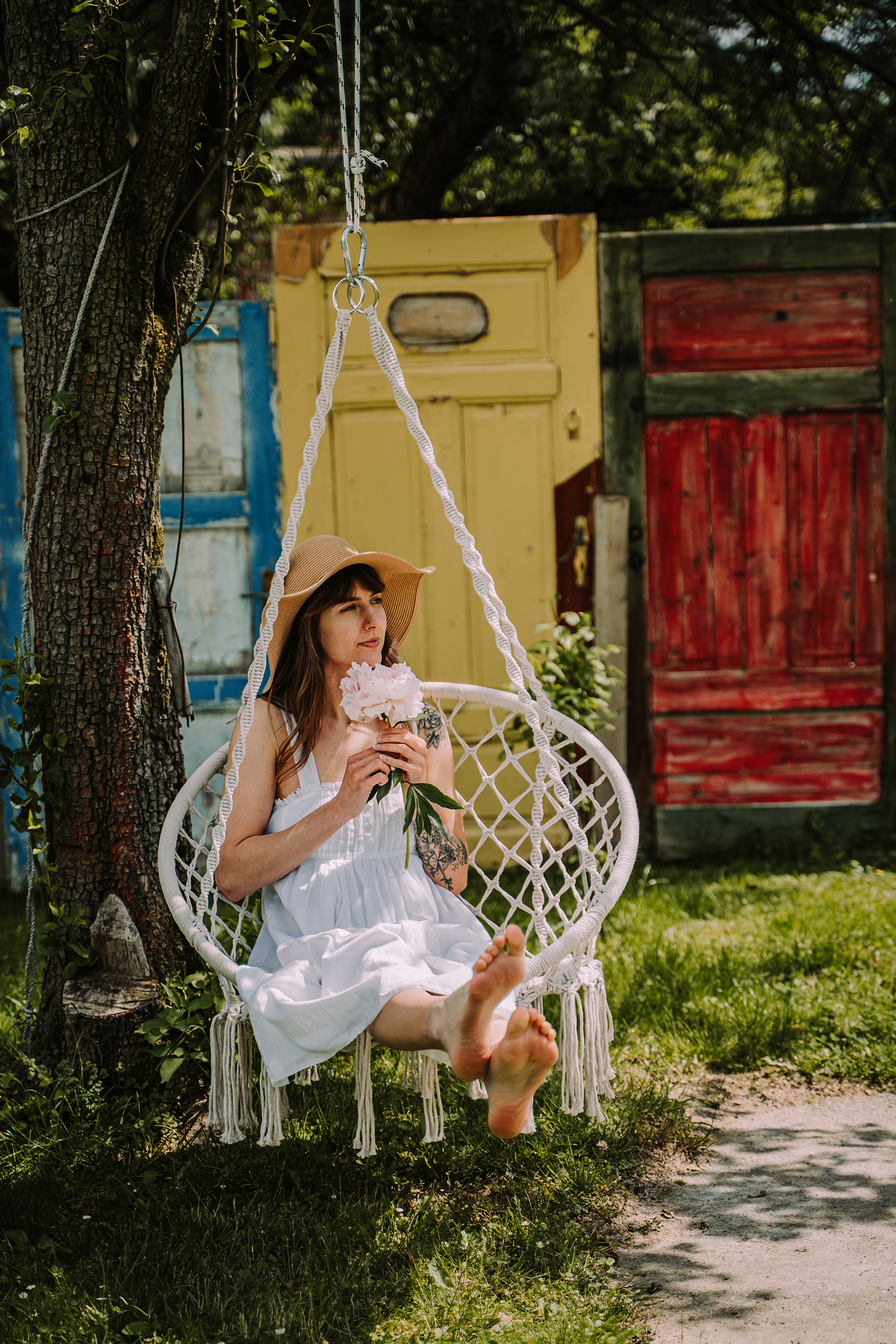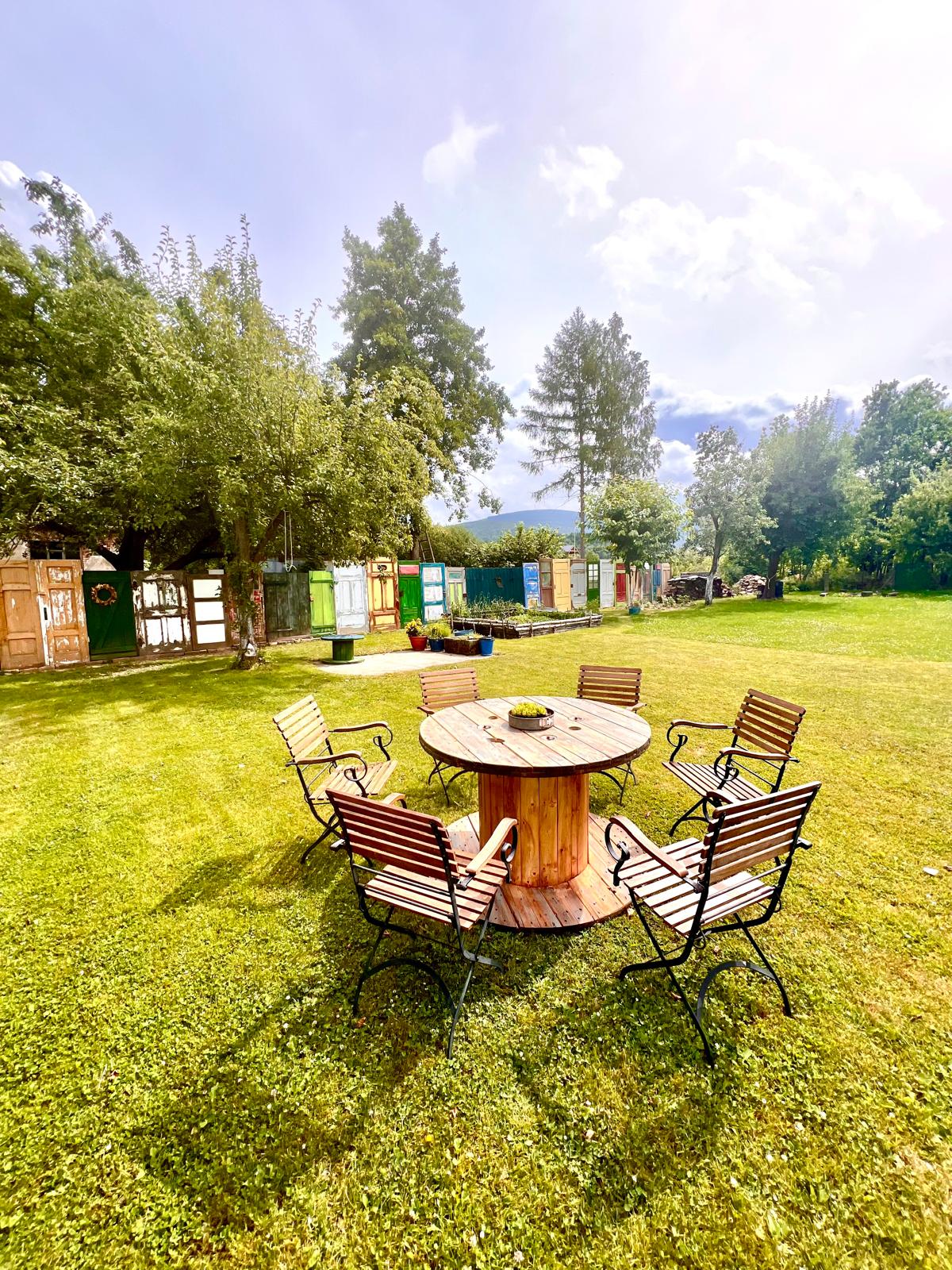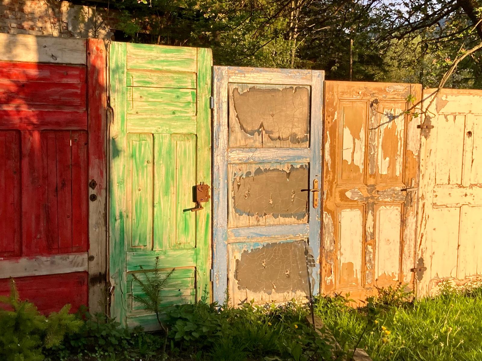 Kolorowe ogrodzenie ze starych drzwi, popołudniowa herbatka zagryzana ciasteczkami upieczonymi przez Renię lub praktyka uważności w kołyszącym się hamaku.